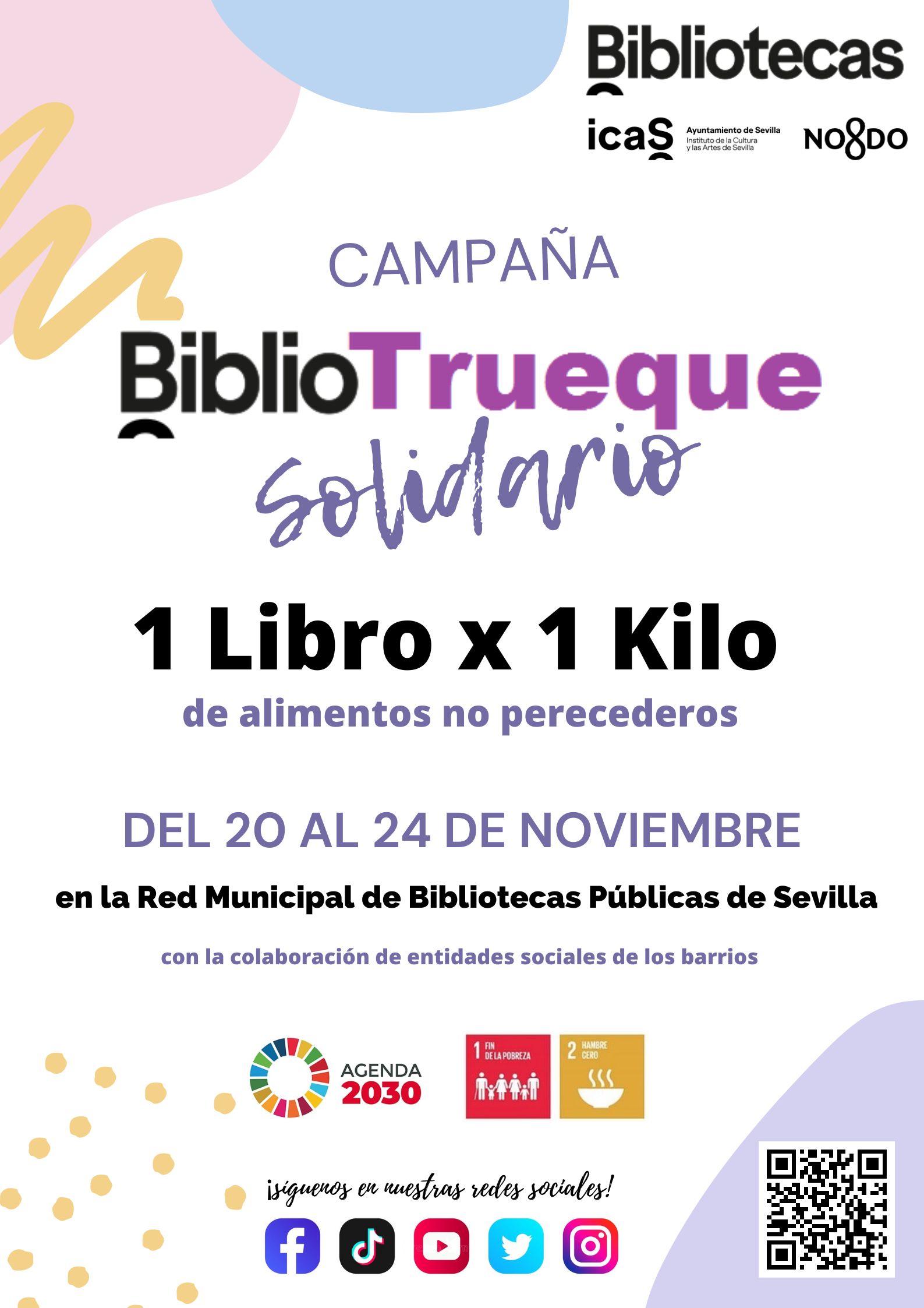 El Ayuntamiento de Sevilla, a través de la Red de Bibliotecas Municipales, arranca la campaña Bibliotrueque solidario, en la que se entregan libros a cambio de alimentos (1 kilo de alimentos no perecederos o 1 litro de leche). Así, las catorce bibliotecas distribuidas por toda la ciudad invitan a los visitantes a este particular intercambio, cuya recaudación se donará a entidades, comedores y obras sociales de los distintos barrios, como Cáritas, Asociación Liman, Comedor Social de la Parroquia San Antonio de Padua de Torreblanca, el Economato social Fundación B.A, Sine Domus, Cruz Roja o la Hermandad Sacramental de la Santa Cruz y Nuestra Señora de los Desamparados, entre otras, que serán después los encargados de distribuirlos a las personas más necesitadas.