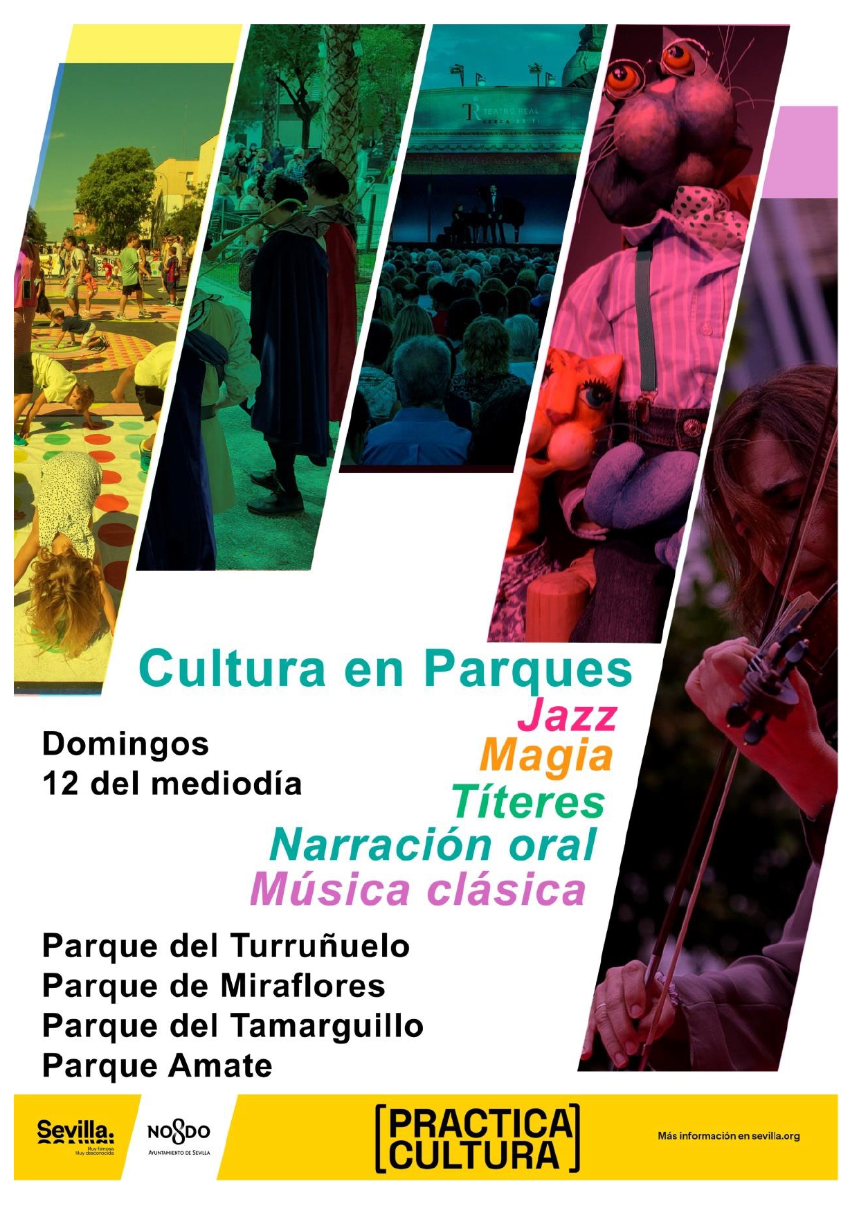 Dentro del programa ‘Practica Cultura’, durante 12 domingos en cuatro parques de la ciudad (Parque de Miraflores, Parque del Tamarguillo, Parque del Turruñuelo y Parque Amate-La Negrilla), celebración de un total de 48 actuaciones. Una programación regular de actividades culturales en zonas verdes que incluyen títeres, narración oral, jazz, música clásica y magia y en el que participan la Asociación de Magia de Sevilla, el Conservatorio Superior de Música Manuel Castillo de Sevilla, la Asociación Sevillana de Jazz (AsseJazz) y la compañía de narración oral Piratas de Alejandría.