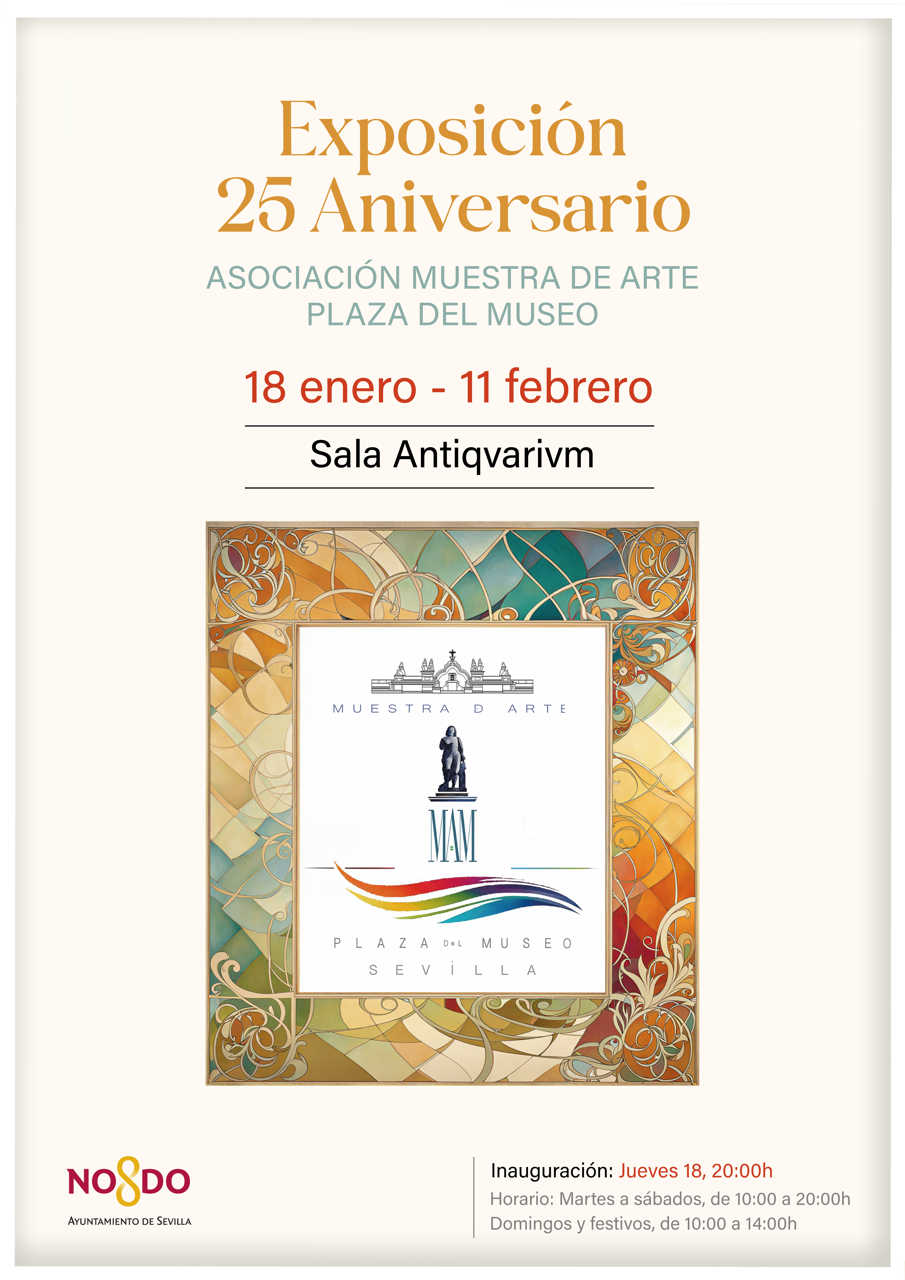 El Ayuntamiento de Sevilla celebra el 25 aniversario de la Asociación Muestra de Arte Plaza del Museo con una exposición en la Sala Antiqvarium que reúne el trabajo de más de medio centenar de artistas.