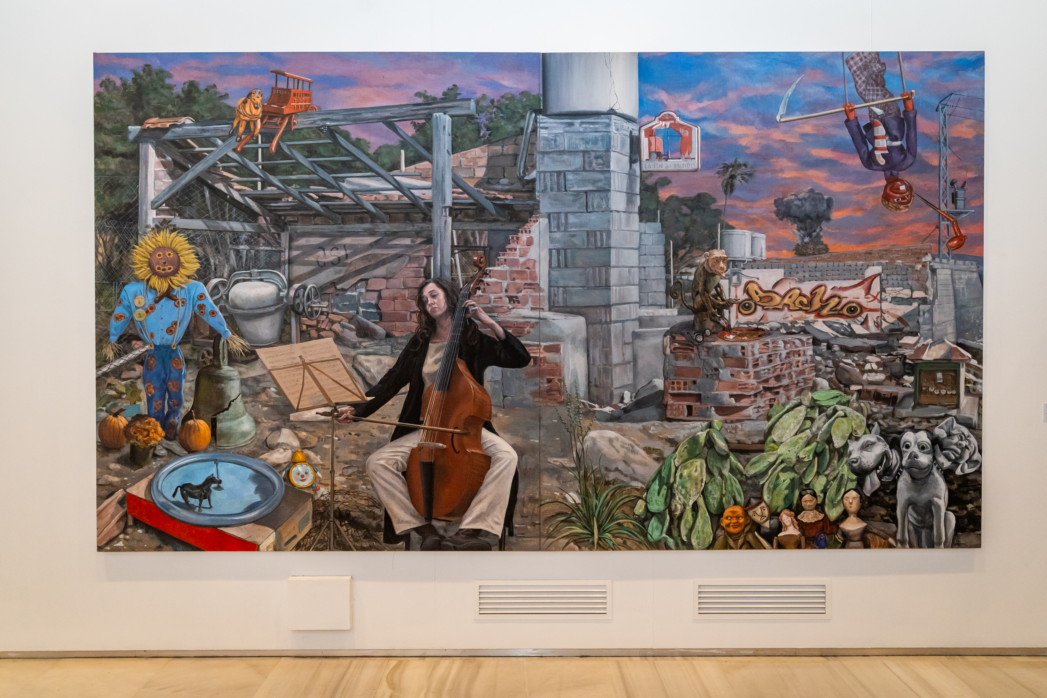 La exposición muestra un conjunto de obras de gran formato y carácter narrativo, muchas de ellas inéditas en Sevilla, convirtiendo el Espacio Santa Clara en una galería viva del universo simbólico de González.