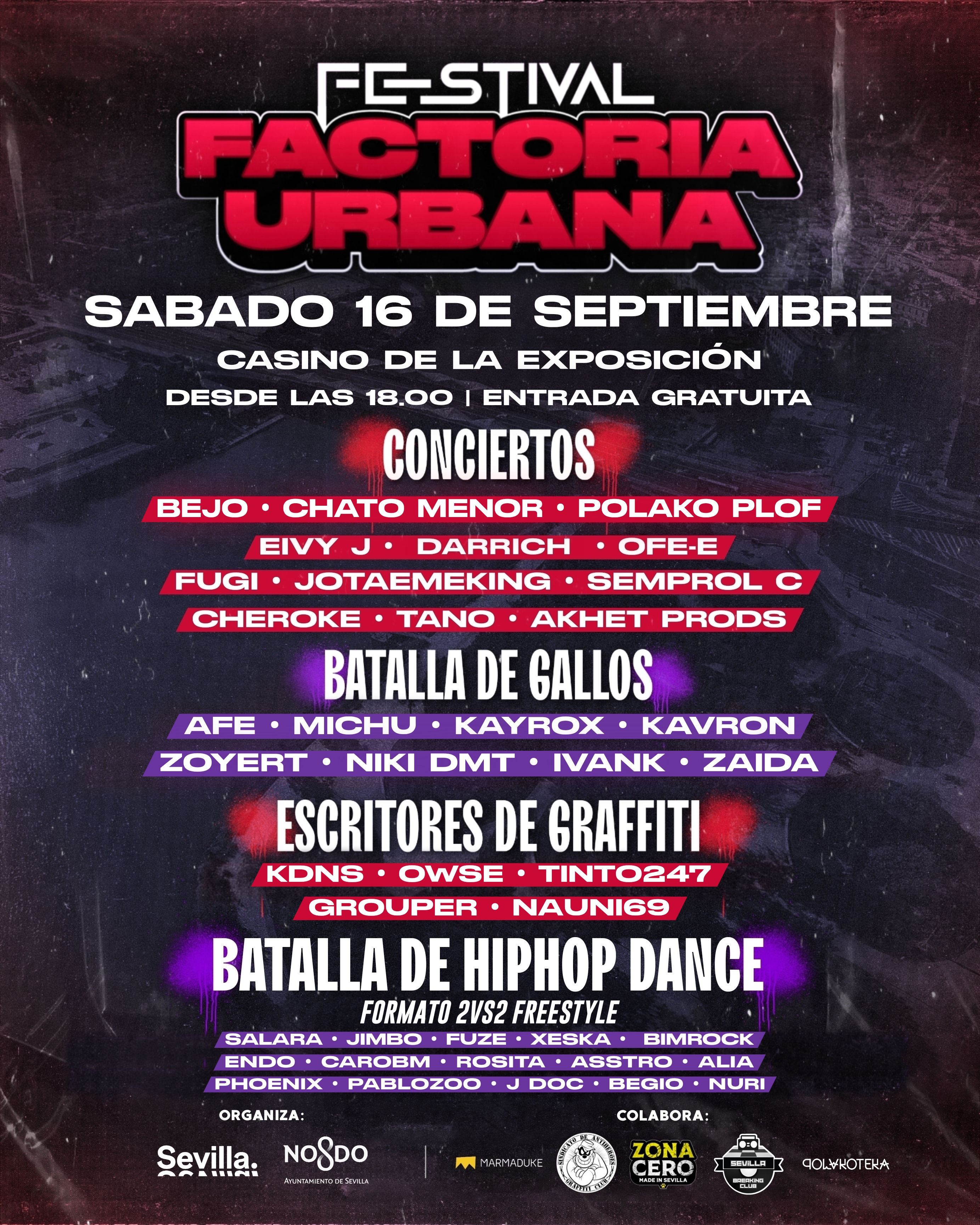 ‘Factoría Urbana’, iniciativa de Factoría Cultural, equipamiento y proyecto de mediación cultural del ICAS, llega el sábado día 16 de septiembre al Casino de la Exposición (Glorieta San Diego s/n) para ofrecer conciertos, batallas de gallo, exhibiciones de arte urbano y batallas de hip-hop dance gratuitos, entre otras actividades.