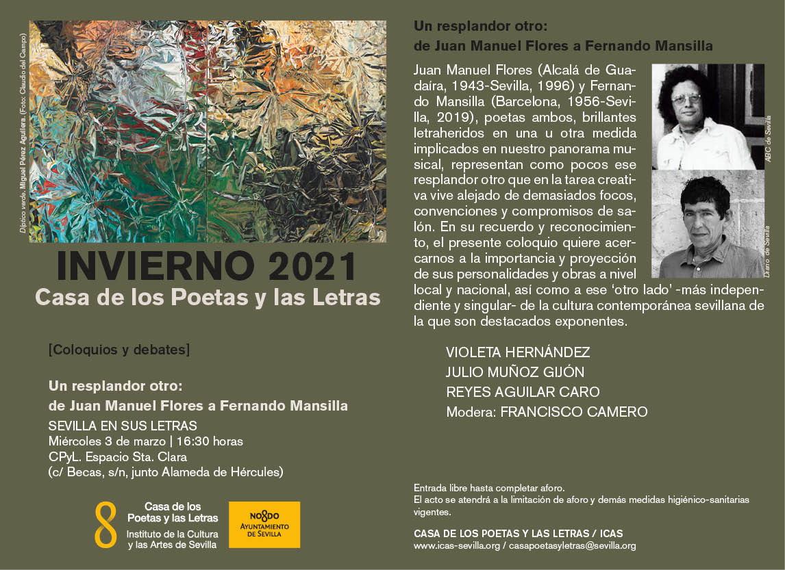 Juan Manuel Flores (Alcalá de Guadaíra, 1943-Sevilla, 1996) y Fernando Mansilla (Barcelona, 1956-Sevilla, 2019), poetas ambos, brillantes letraheridos en una u otra medida implicados en nuestro panorama musical, representan como pocos ese resplandor otro que en la tarea creativa vive alejado de demasiados focos, convenciones y compromisos de salón. En su recuerdo y reconocimiento, el presente coloquio quiere acercarnos a la importancia y proyección de sus personalidades y obras a nivel local y nacional, así como a ese ‘otro lado’ -más independiente y singular- de la cultura contemporánea sevillana de la que son destacados exponentes.