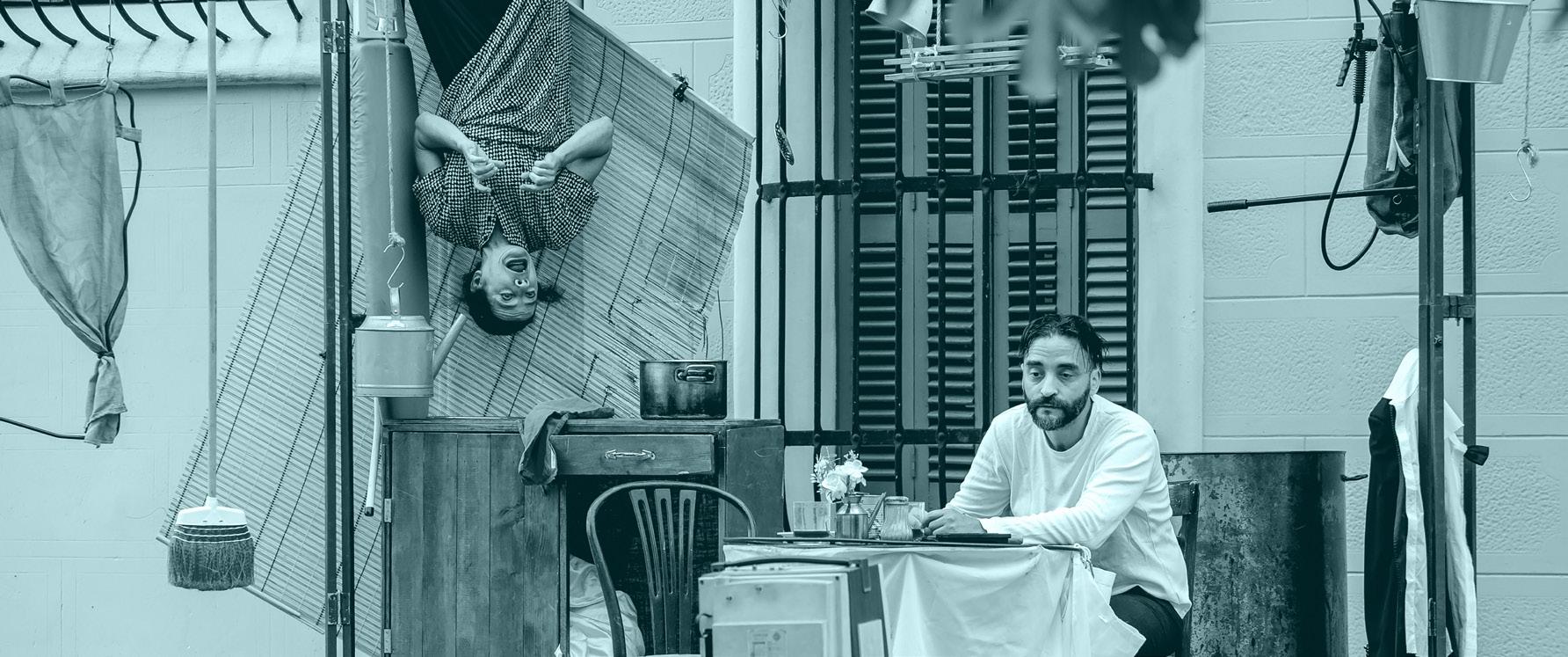 Choque de personalidades y actitudes en terreno doméstico. La rutina de pareja en una casucha que, aunque destartalada y precaria, no deja de ser hogar. Ella, hiperactiva e histriónica, no puede parar de hacer de todo. Él, impertérrito, permanece impasible ante el torbellino que le rodea. Aunque todo se ponga patas arriba, aunque el respetable sea invitado a formar parte de este caos. Maestría de clowns que dan una vuelta de tuerca a lo cotidiano para destapar lo absurdo y lo divertido de nuestras miserias.