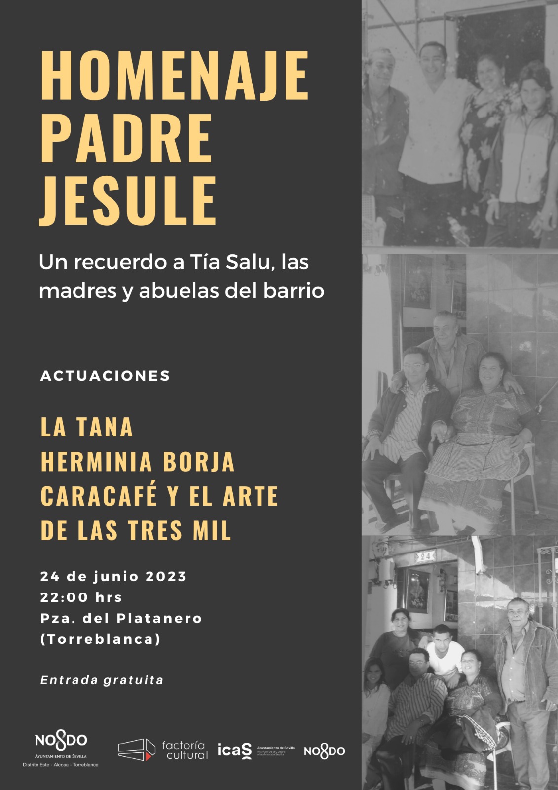 Concierto homenaje a la figura del sacerdote jesuita Jesús Andrade Ortega, conocido como Padre Jesule y el "cura gitano". También se recordará a la Tía Salu y a todas las madres y abuelas del barrio. Con las actuaciones de La Tana, Herminia Borja, Caracafé y el arte de las Tres Mil.