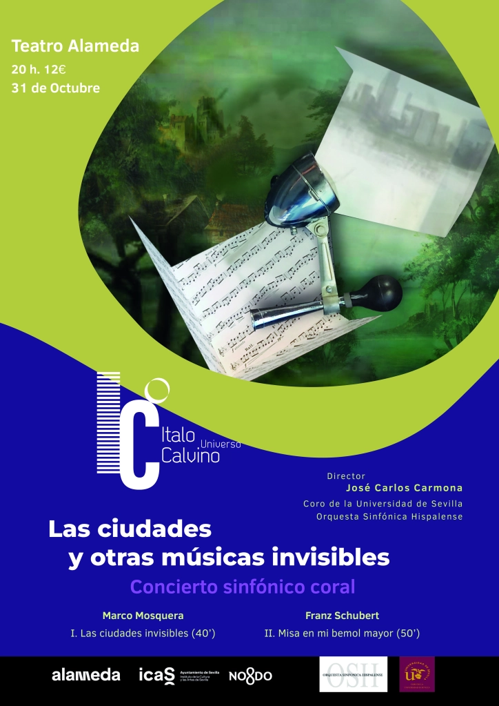 El concierto sinfónico coral que sirve de clausura al homenaje a Italo Calvino en Sevilla constará de dos partes. La primera de ellas “Las ciudades invisibles” (40’) ha sido compuesta expresamente para el homenaje por el compositor Marco Mosquera. La segunda parte: Misa en mi bemol mayor (50’) de Franz Schubert. El concierto será dirigido por José Carlos Carmona e interpretado por el Coro de la Universidad de Sevilla y la Orquesta Sinfónica Hispalense.