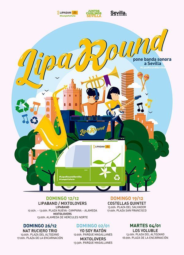 Sobre los vehículos de Lipasam, transformados en escenarios móviles, cabalgará una exquisita selección de grupos y formaciones locales para todos los públicos y gustos. Lipaband, Mixtolovers, Nat Ruciero Trío, Las Costellas Quintet, Los Voluble son algunas de las propuestas de LipaRound.