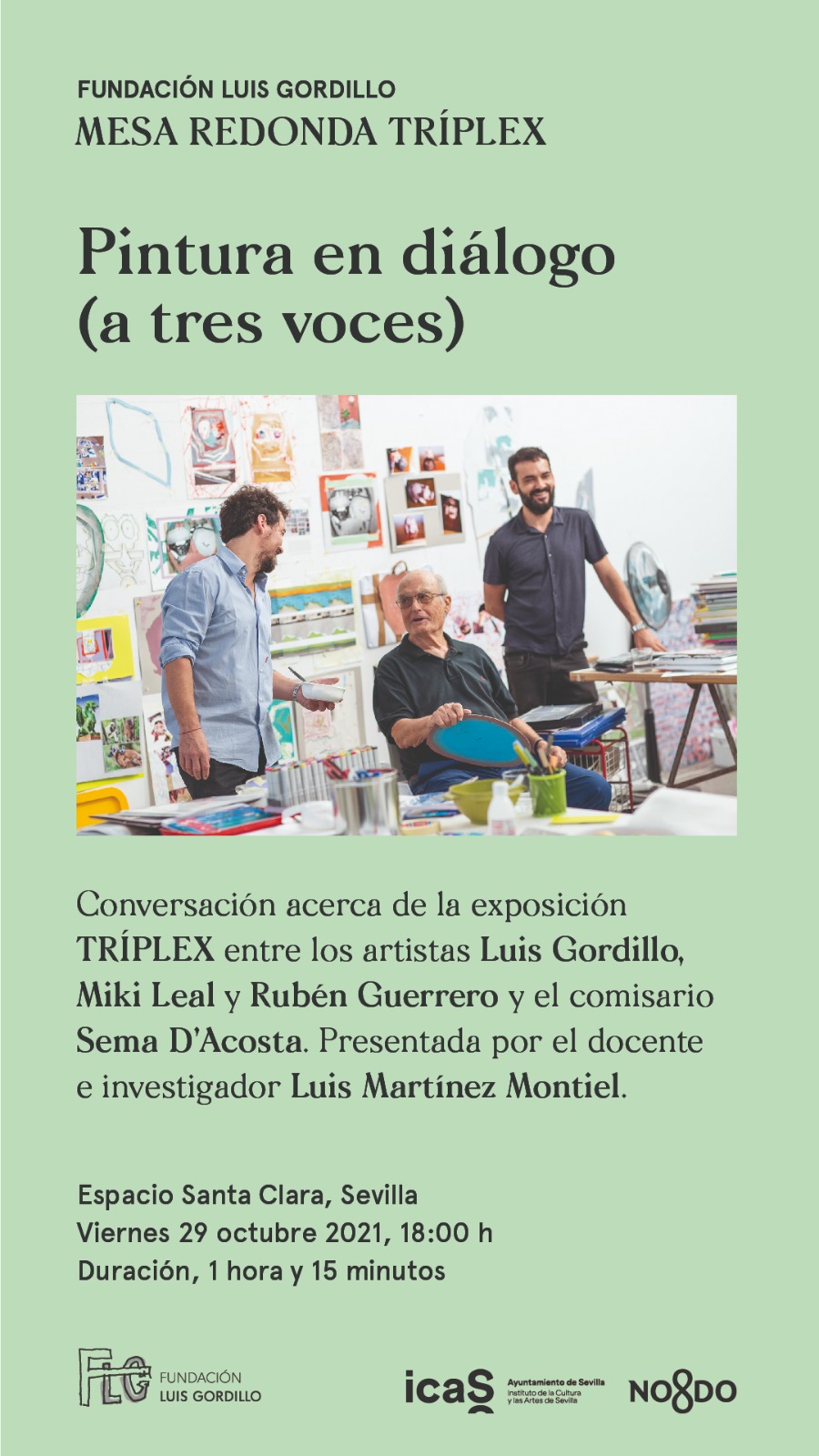 Con motivo de la exposición 'Tríplex' que concluye el 9 de enero de 2022 en la Sala Luis Gordillo – Espacio Santa Clara de Sevilla, la Fundación Luis Gordillo ha organizado una mesa redonda con los protagonistas a modo de colofón del proyecto. El objetivo de este encuentro es que sean los mismos autores y el comisario los que expliquen algunas de las claves de esta inusual iniciativa, que sean ellos los que a través de una charla distendida comenten lo más destacado de esta particular confluencia pictórica. En sesenta años de trayectoria, es la primera vez que un autor de sobra conocido por todos como Luis Gordillo se compromete en una distancia tan corta con otros dos artistas, generando junto a ellos varias piezas comunes y manteniendo un alto nivel de complicidad.