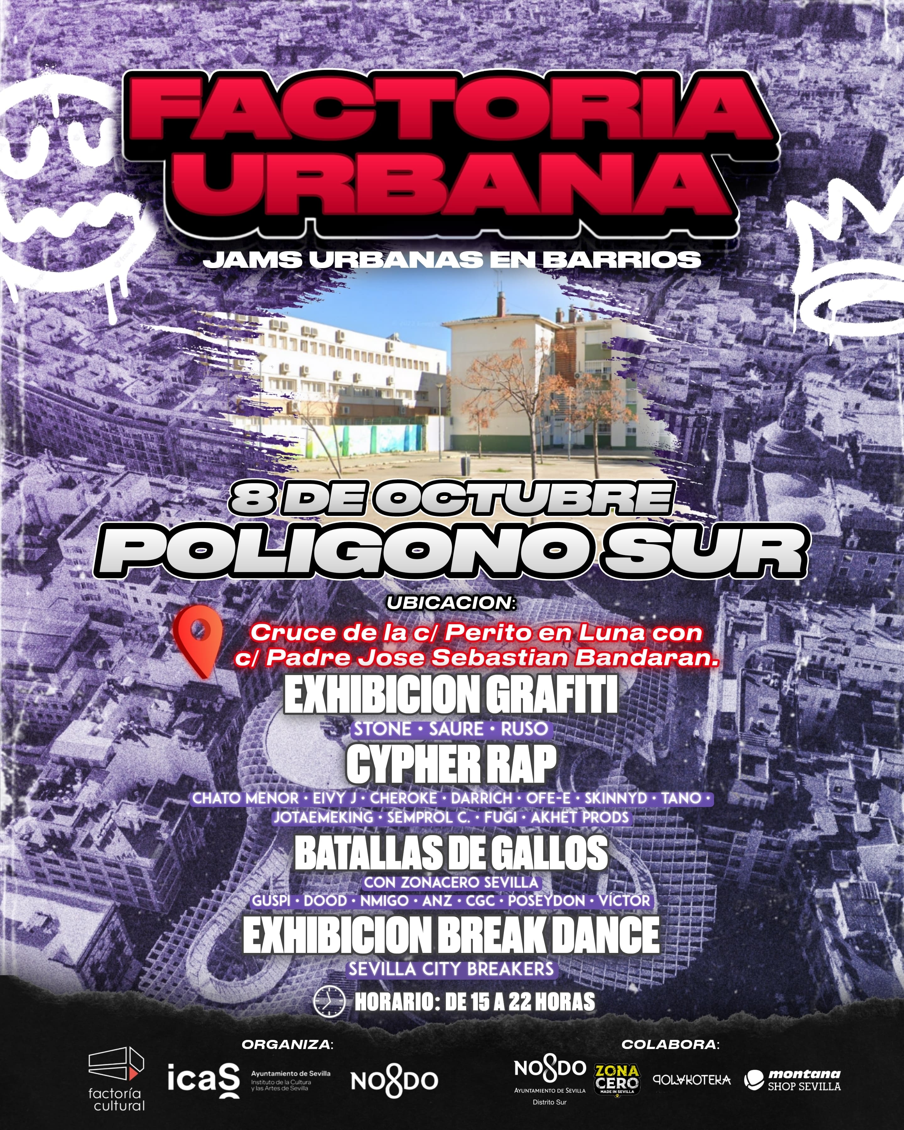 Exhibición de grafiti, cypher rap, batallas de gallos y exhibición de break dance son las propuestas que el proyecto Factoría Urbana acerca a Polígono Sur para dar a conocer los artistas urbanos del barrio.