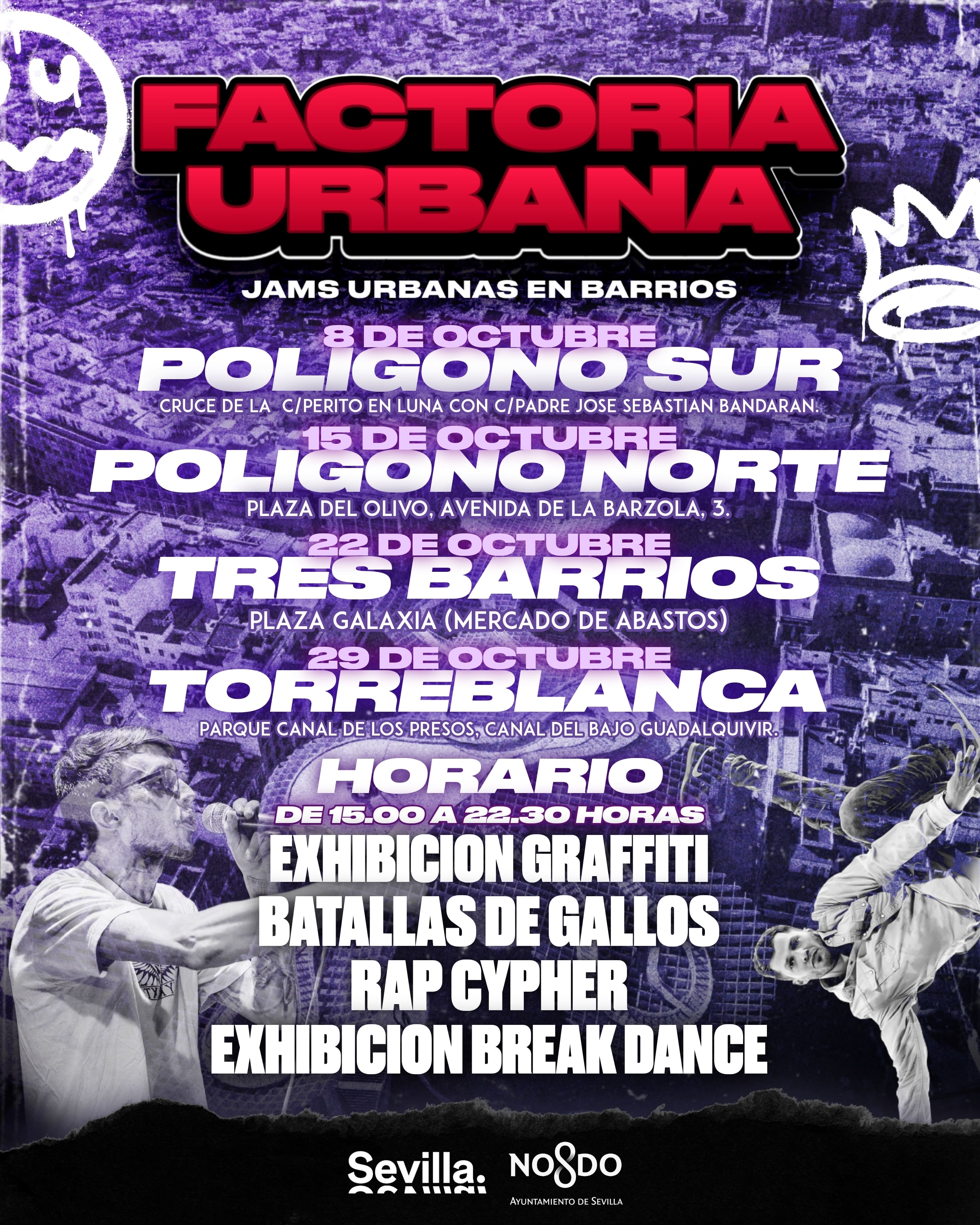Exhibición de grafiti, cypher rap, batallas de gallos y exhibición de break dance son las propuestas que el proyecto Factoría Urbana acerca a Tres Barrios para dar a conocer los artistas urbanos del barrio.