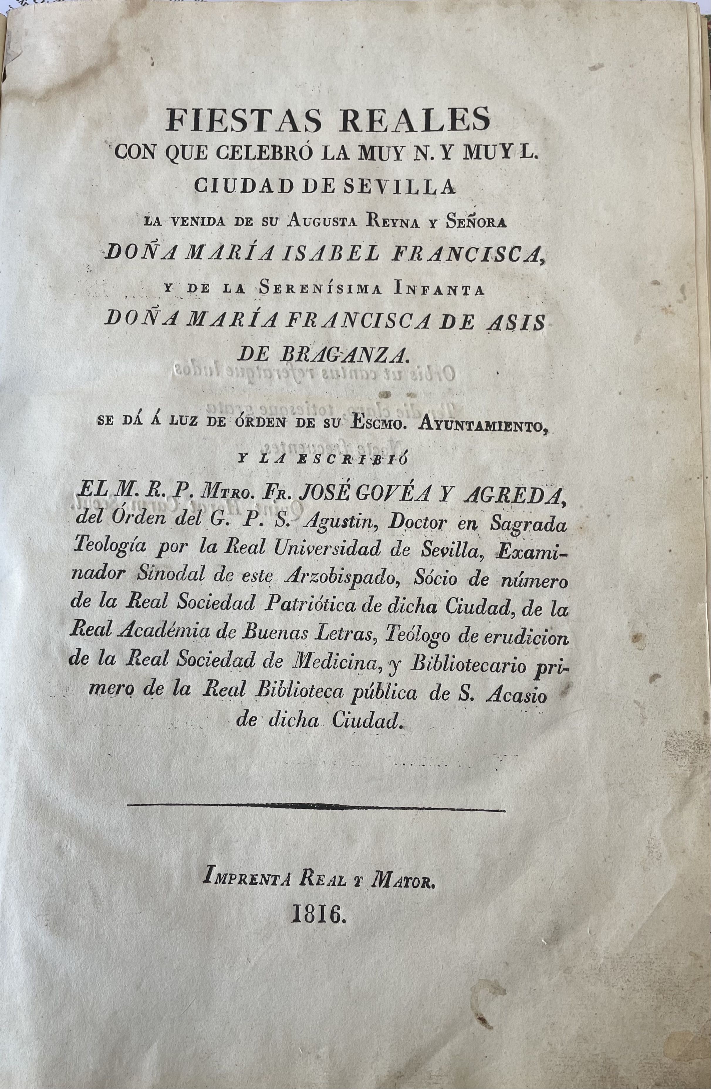Govéa y Agreda, José (1816). Fiestas reales con que celebró la Muy N. y Muy L. ciudad de Sevilla la venida de su Augusta Reyna y Señora Reyna Doña María Isabel Francisca, y de la Serenísima Infanta Doña María Francisca de Asís de Braganza. [S.l.]: Imprenta Real y Mayor.