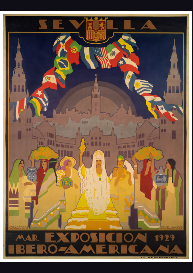 Quizá la pieza más importante de esa documentación gráfica sea el cartel oficial de dicha exposición, que fue encargado a un artista de la talla de Gustavo Bacarisas Podestá (Gibraltar, 1973 – Sevilla, 1971). El cartel es de una calidad difícilmente superable, por su composición, al servicio de un iberoamericanismo evidente, y por un colorido original y especial.