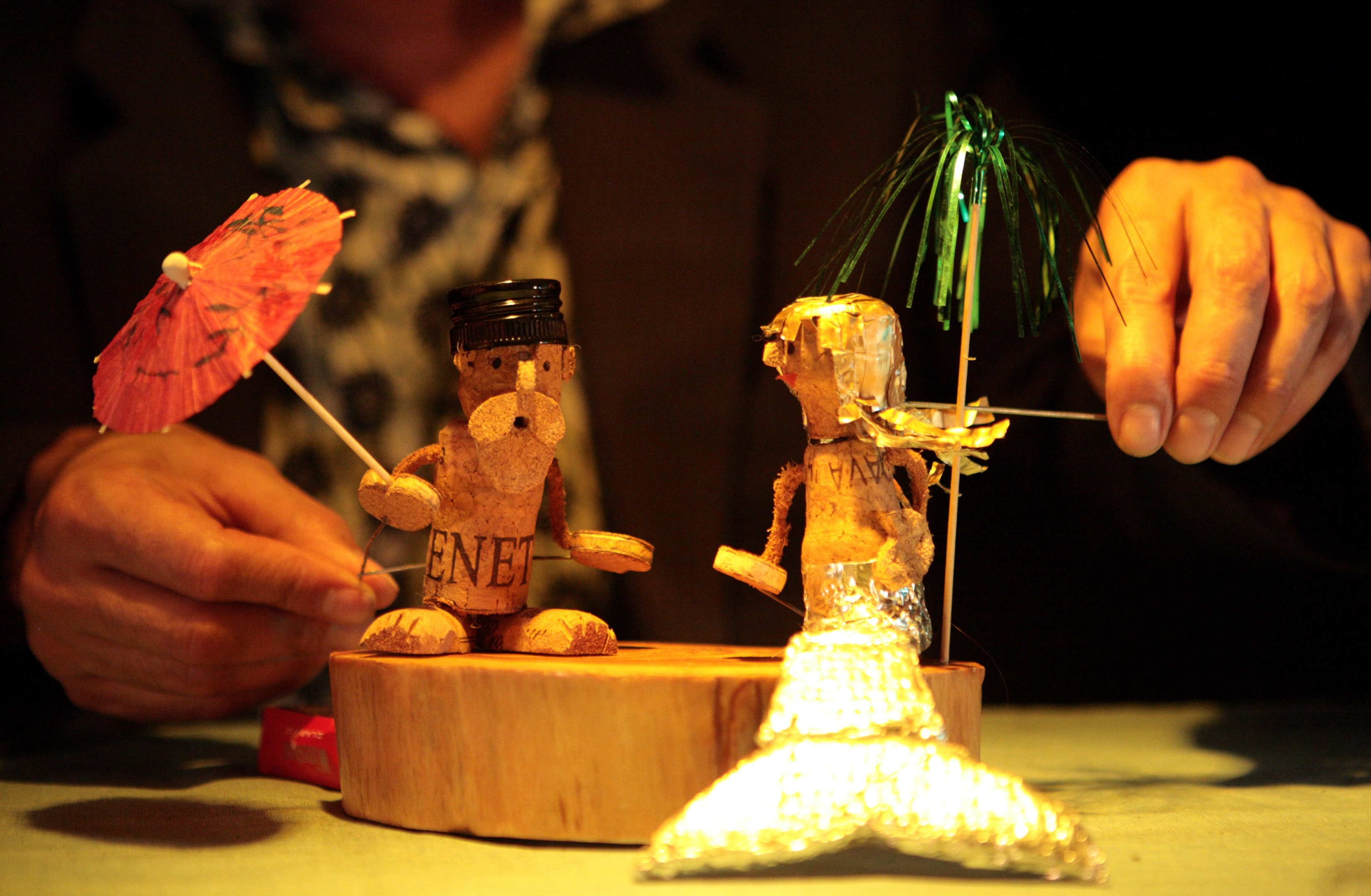 NAÚFRAGOS es un espectáculo unipersonal de títeres y objetos de pequeño formato, sin palabras, para aforo reducido y espacios poco convencionales, donde los tapones de corcho, cartones de vino, botellas, cava, sacacorchos… y la ebria soledad, crean el imaginario etílico de la isla desierta que llevamos dentro. La obra consta de una primera parte de 25 minutos de duración, y una segunda parte de interacción con el público, no fija en su duración, que dependerá del público, los vinos y el lugar de representación.