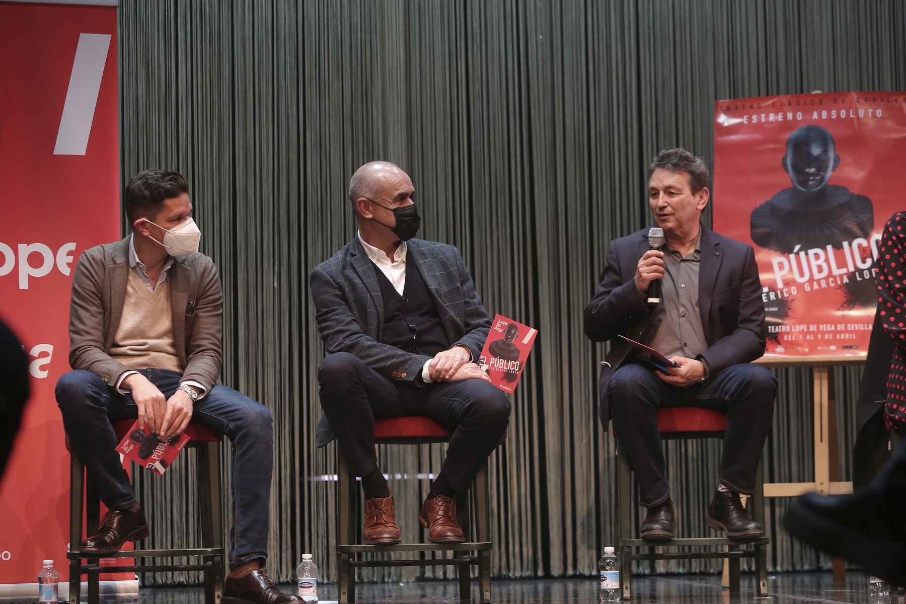 La vanguardia teatral llega esta semana al Lope de Vega de la mano de la compañía Teatro Clásico de Sevilla y su última incursión en los clásicos del siglo XX: ‘El público’, la obra más personal y surrealista de Federico García Lorca. El montaje, con dramaturgia y dirección escénica de Alfonzo Zurro, contará con varias representaciones, seis en total, entre los días 1 y 9 de abril. Así se ha anunciado hoy en una rueda de prensa que ha contado con la presencia del alcalde, Antonio Muñoz; el director del Teatro, Carlos Forteza; el director de la compañía e intérprete, Juan Motilla; Alfonso Zurro; la directora y productora, Noelia Díez; el diseñador de escenografía y vestuario, Curt Allen Wilmer; y el diseñador de la iluminación, Florencio Ortiz.