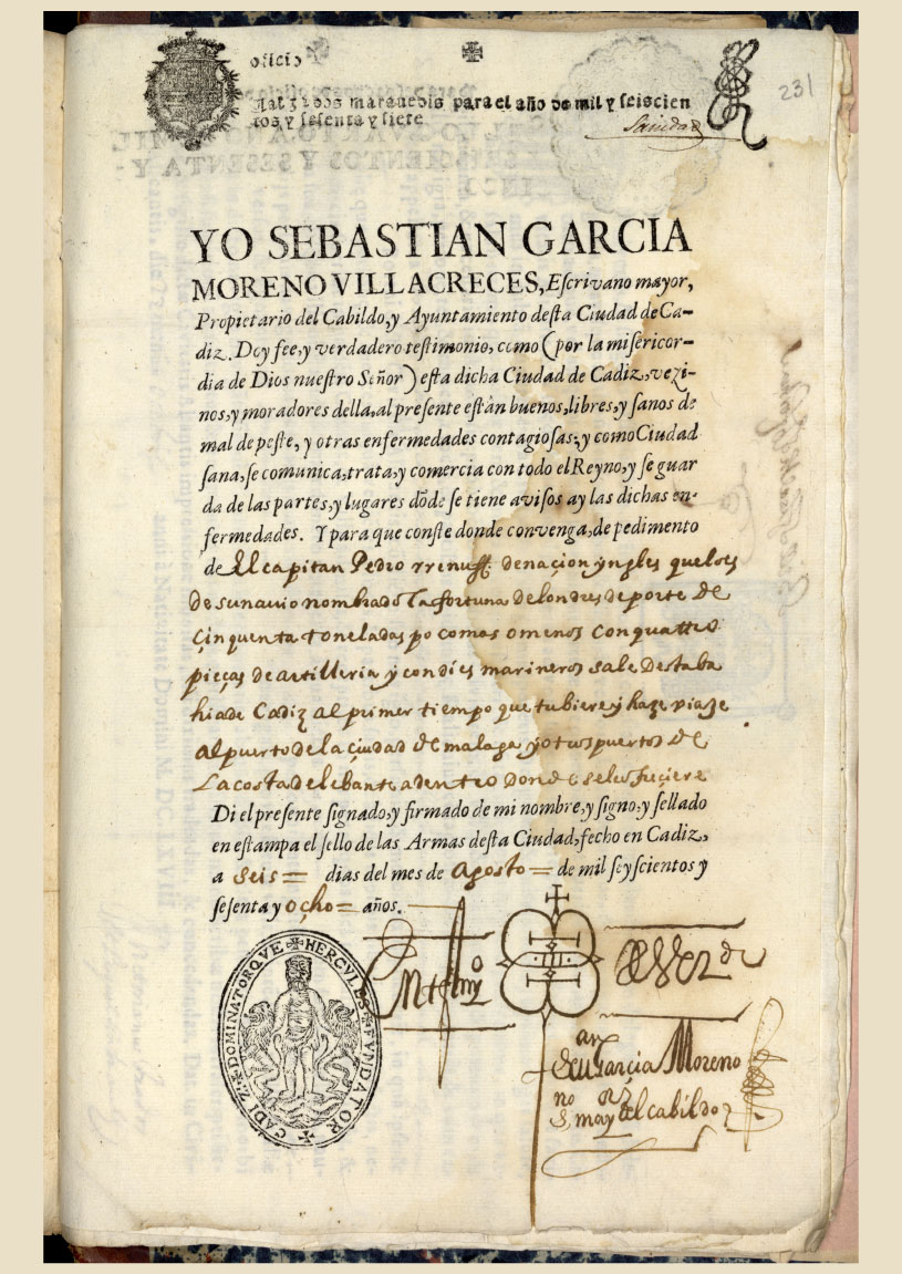 Si en la noticia anterior pudimos contemplar y analizar una carta patente del Archivo Municipal de Sevilla expedida en el puerto de Cartagena en 1820, en esta ocasión podemos ver una de las más antiguas de la serie, fechada en Cádiz el 6 de agosto de 1668.