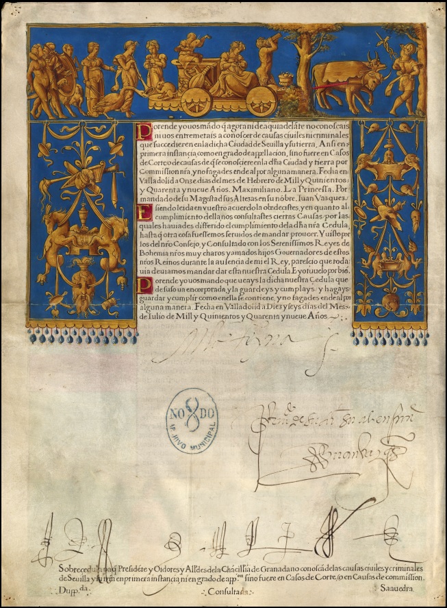 El 1 de diciembre se ha inaugurado una exposición dedicada al Renacimiento en Sevilla en el Museo de Bellas Artes de Sevilla. Pinturas, esculturas, platería y algún documento componen un conjunto tan reducido –poco más de 30 obras- como bien escogido. El Ayuntamiento de Sevilla ha contribuido con el préstamo de dos piezas realmente excepcionales: las mazas capitulares de plata cinceladas y grabadas, obra de Francisco de Valderrama (1587), y la real cédula de Carlos I certificando la autonomía judicial de Sevilla frente a Granada (1549). Este segundo caso, un documento escrito y pintado sobre pergamino procedente del Archivo Municipal de Sevilla (Servicio de Archivo, Hemeroteca y Publicaciones del ICAS), testimonia la entrada del Renacimiento en el ámbito de los documentos miniados de una forma incontestable y en muchos detalles: la figura del emperador, vestido como un héroe romano, rodeado de escenografía clásica, el escudo de Sevilla, las figuras mitológico-teologales, la decoración de candelieri. En el tercio inferior, una magnífica perspectiva de Sevilla vista desde Triana, con una mezcla de estilos flamenco y renacentista, protegida por las santas patronas, Justa y Rufina, a modo de madonnas romanas. En el reverso del documento, oro sobre azul intenso, la inspiración clásica del artista es todavía más evidente en esa procesión mitológica encabezada por el dios Mercurio. A muchos sorprenderá el valor artístico y la madurez de una obra de arte espléndida y desarrollada en las pequeñas dimensiones de un documento de gran importancia para la historia de la Ciudad. La exposición Arte del Renacimiento en Sevilla puede visitarse desde 2 de diciembre de 2022 al domingo 12 de marzo de 2023.