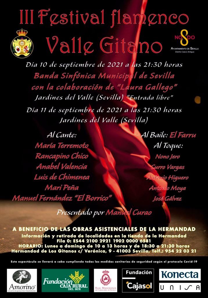 Otra de las propuestas destacadas del fin de semana es la tercera edición del Festival Flamenco Valle Gitano, una cita con fines solidarios impulsada por la Hermandad de Los Gitanos y el Ayuntamiento. El Distrito Casco Antiguo y el Área de Fiestas Mayores colaboran en este evento que se desarrolla durante dos jornadas (viernes y sábado) en las que contará con la Banda Sinfónica Municipal de Sevilla acompañada por Laura Gallego y con artistas flamencos como María Terremoto, Rancapino Chico, Anabel Valencia o El Farru, entre otros.
