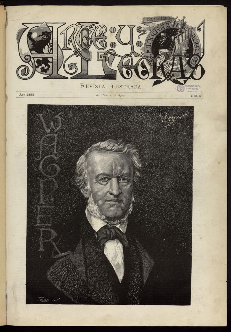 Por su parte, la revista Artes y Letras apareció en Barcelona el 1 de julio de 1882 y fue pensada como regalo para los suscriptores de la colección de libros llamada Biblioteca “Arte y Letras”, y editada por los hermanos Eduard y Lluís Domènech i Montaner. Los hermanos Domènech y Montaner tenían a su alcance todas las posibilidades materiales –taller, maquinaria y personal, heredados del taller de su padre Pere Domènech i Saló, encuadernador e impresor– para realizar su sueño de editar con varios amigos, una revista ilustrada (con ilustraciones hechas expresamente) y dedicada a la literatura ya las artes, de gran calidad. Precisamente, nuestros ejemplares conservan las láminas fuera de texto que la revista regalaba a sus suscriptores y que, por sus características (se regalaban para ser enmarcadas), son de gran rareza.