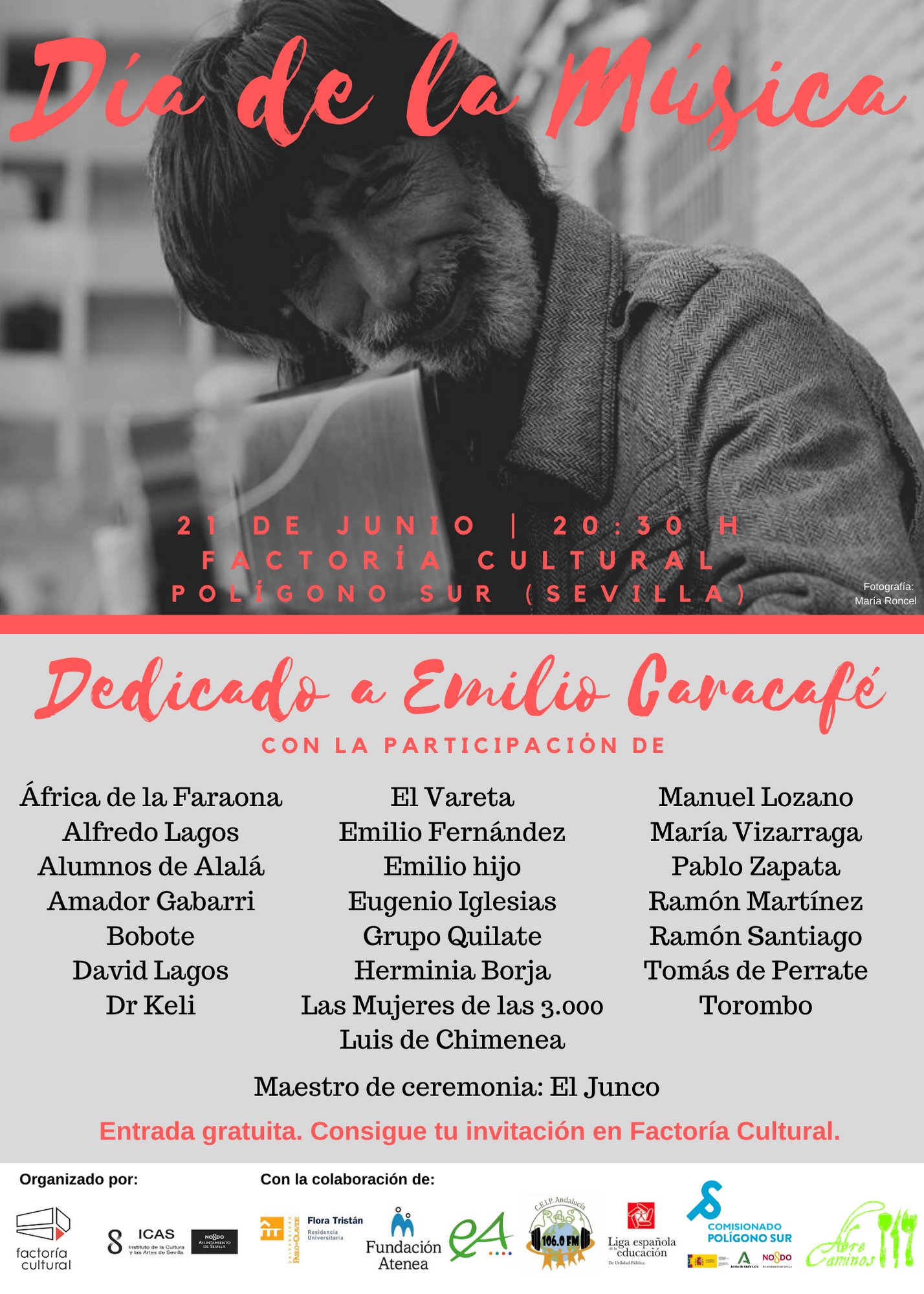 Factoría Cultural, equipamiento dependiente del Instituto de la Cultura y las Artes (ICAS) del Ayuntamiento de Sevilla, celebrará el próximo lunes 21 el Día Europeo de la Música con un espectáculo en el que tomarán parte más de una veintena de artistas, que subirán al escenario de Factoría Cultural, esta vez abierto hacia el exterior, en un concierto dedicado al guitarrista Emilio Caracafé.