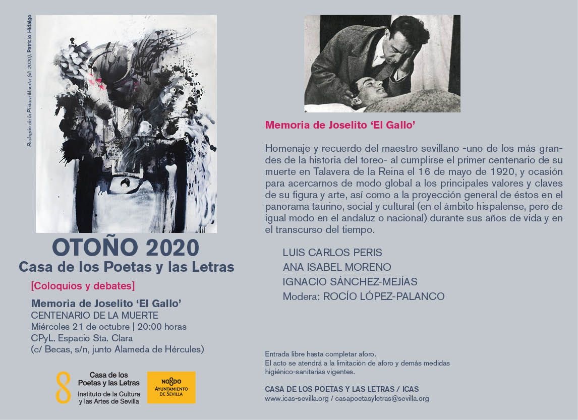 La Casa de los Poetas y las Letras del Instituto de la Cultura y las Artes (ICAS) del Ayuntamiento de Sevilla se abre esta semana a la figura del torero Joselito ‘El Gallo’ con una mesa coloquio el miércoles 21 de octubre para homenajear y recordar al maestro sevillano, uno de los diestros más destacados de la historia del toreo. El delegado de Hábitat Urbano, Cultura y Turismo, Antonio Muñoz, ha puesto en valor la programación que este otoño ofrece semanalmente la Casa de los Poetas y las Letras con la puesta en marcha de una serie de jornadas y conferencias que buscan la recuperación del patrimonio literario de la ciudad, pero también analizar la esencia y legado de personajes ilustres de Sevilla, como es el caso del torero.