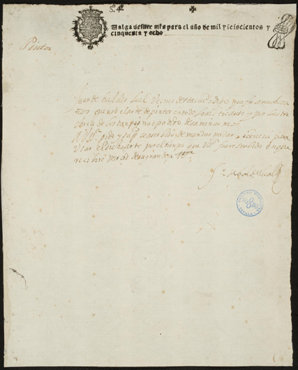 En este caso se trata de la instancia que en 1658, como recoge el timbre del papel porque como la gran mayoría de las instancias no está fechada, presenta el pintor ante el cabildo municipal pidiendo licencia para ejercer su arte en la ciudad; señalando la circunstancia de que aún no se había podido examinar para conseguir el correspondiente título en el arte de pintar. Para ejercer los oficios y artes, los artistas se formaban entrando de aprendiz en los talleres de maestros conocidos, para posteriormente pasar por un examen de maestría, adquiriendo el título de pintor que les permitía desarrollar su carrera profesional. La firma de este documento, en tinta, se compone del nombre abreviado y los dos apellidos; a continuación del segundo apellido, sigue una escueta rúbrica.