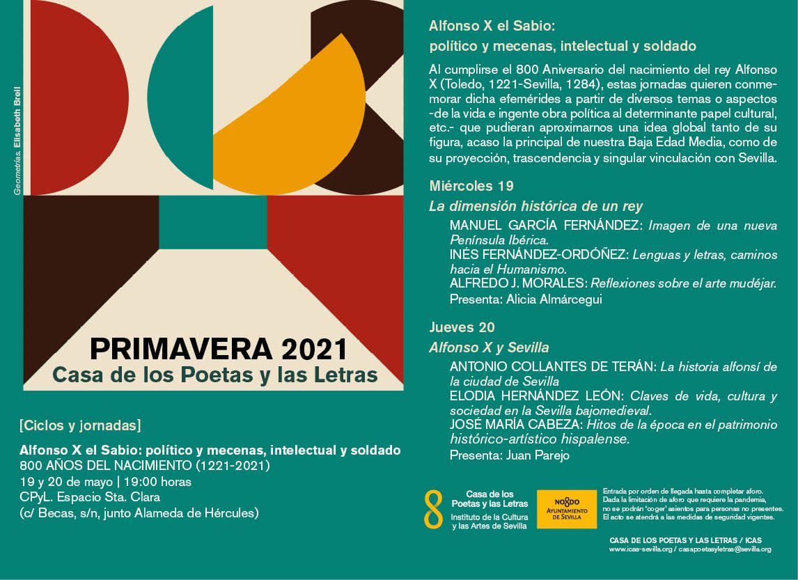 La Casa de los Poetas y las Letras, dependiente del Instituto de la Cultura y las Artes de Sevilla (ICAS), dedica los días 19 y 20 de mayo su programación semanal a la figura del rey Alfonso X el Sabio con la celebración de unas jornadas enmarcadas en su calendario primaveral de actividades. Al cumplirse el 800 Aniversario del nacimiento del rey Alfonso X (Toledo, 1221-Sevilla, 1284), esta nueva propuesta de la Casa de los Poetas y las Letras quiere conmemorar esta efemérides a partir de diversos temas o aspectos -de la vida e ingente obra política al determinante papel cultural, etc.- que puedan esbozar una idea global tanto de su figura, como de su proyección, trascendencia y singular vinculación con Sevilla.