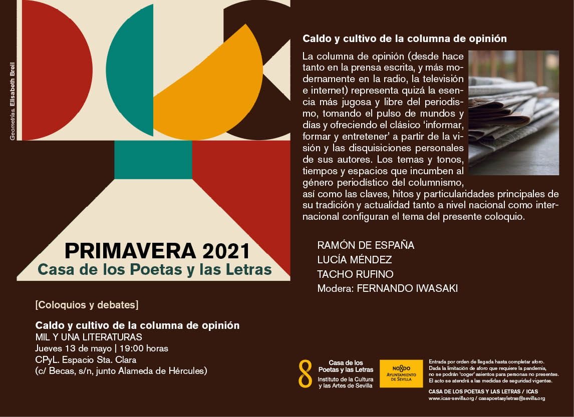 El género periodístico del columnismo centrará el próximo encuentro de la Casa de los Poetas y las Letras. ‘Caldo y cultivo de la columna de opinión’ lleva por título la cita semanal de este equipamiento del Instituto de la Cultura y las Artes de Sevilla (ICAS) del Ayuntamiento de Sevilla, que tendrá lugar en su sede, el Espacio Santa Clara, el próximo jueves 13.
