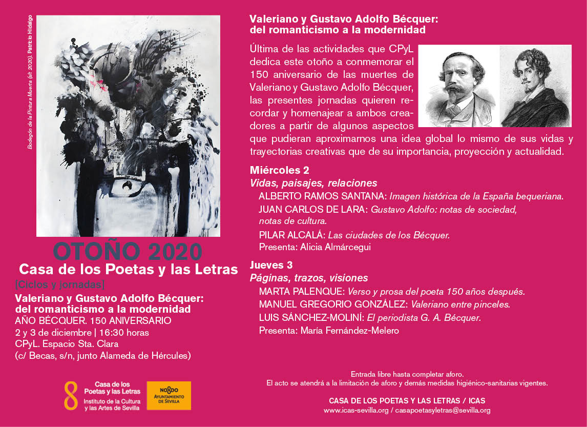 La programación de la Casa de los Poetas y las Letras del Instituto de la Cultura y las Artes (ICAS) del Ayuntamiento de Sevilla arranca su programación del mes de diciembre con la conmemoración del Año Bécquer, a través de las jornadas ‘Valeriano y Gustavo Adolfo Bécquer: del romanticismo a la modernidad’ (días 2 y 3). Tras la celebración en el mes de octubre de un primer encuentro, centrado en la ciudad histórica, cultural y social que les tocó vivir, esta nueva cita ahondará en la creación, trayectorias y proyección de ambos hermanos atendiendo, por un lado, a sus ‘Vidas, paisajes, relaciones’; y, por otro, a sus ‘Páginas, trazos, visiones’.
