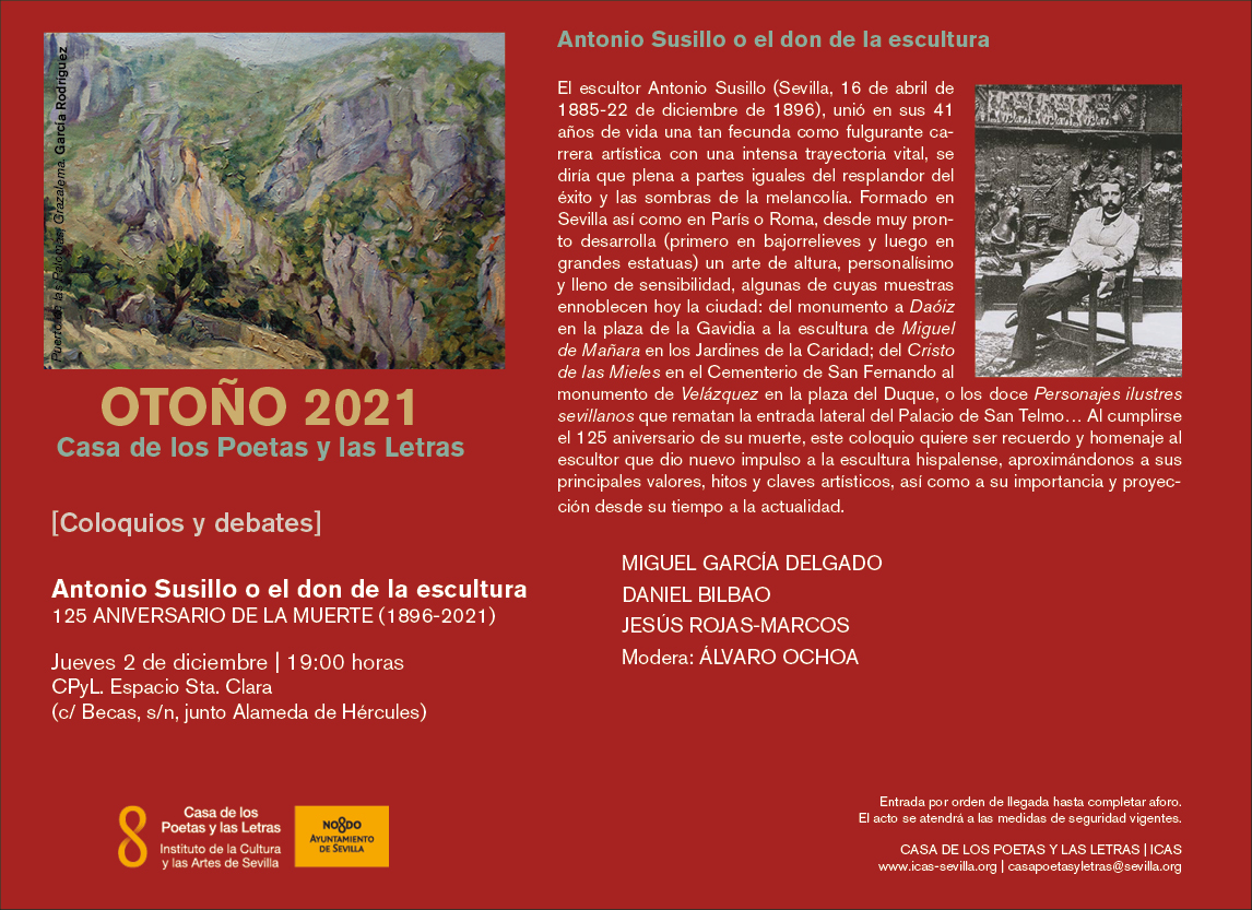 El escritor sevillano Antonio Susillo centrará la atención del siguiente encuentro convocado por la Casa de los Poetas y las Letras, dependiente del Instituto de la Cultura y las Artes de Sevilla (ICAS) del Ayuntamiento de Sevilla. Será el próximo 2 de diciembre en el coloquio titulado ‘Antonio Susillo o el don de la escultura’; una cita en la que se le rendirá homenaje y se le recordará con motivo del 125 aniversario de su muerte.