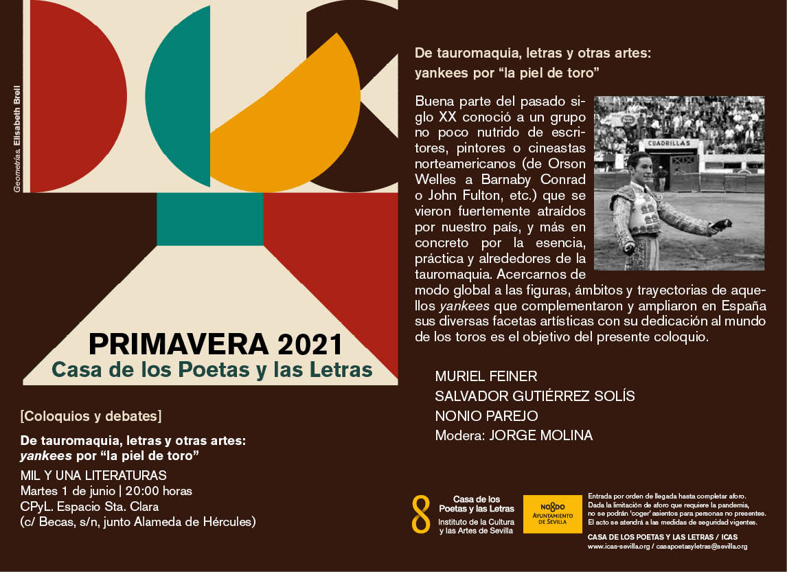 La fascinación que muchos creadores norteamericanos sintieron por la tauromaquia durante el pasado siglo XX centrará la próxima cita primaveral de la Casa de los Poetas y las Letras. Así, el Espacio Santa Clara (sede de este equipamiento del ICAS) acogerá el martes 1 de junio un coloquio en el que tomarán parte los autores Muriel Feiner, Salvador Gutiérrez Solís y Nonio Parejo, con el periodista Jorge Molina como encargado de introducir la temática y de llevar las riendas de este encuentro que se suma a la variedad de propuestas artísticas que brinda la ciudad.