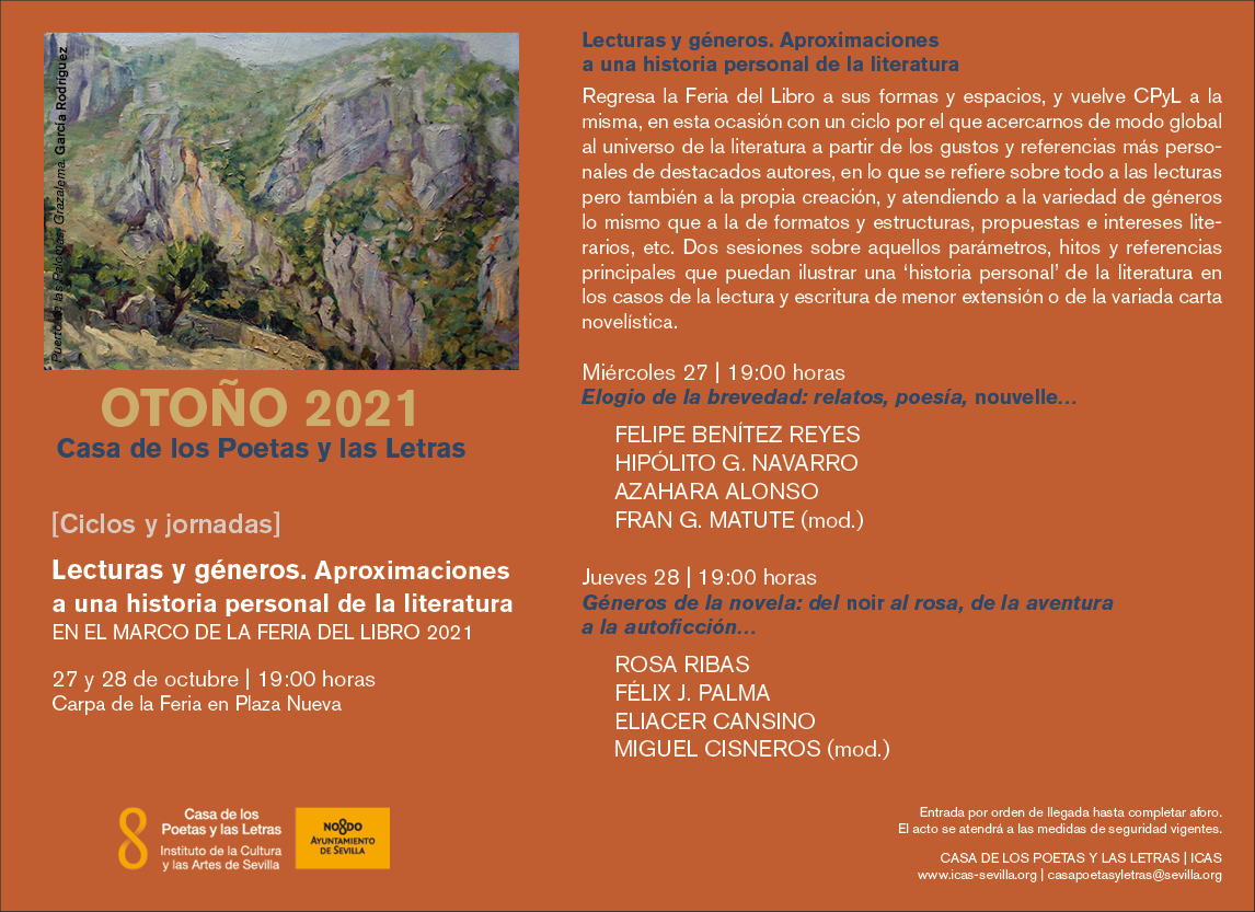 La Casa de los Poetas y las Letras, dependiente del Instituto de la Cultura y las Artes de Sevilla (ICAS) del Ayuntamiento de Sevilla, continúa su programación otoñal los días 27 y 28 de octubre. Y lo hace en Plaza Nueva en el marco de un evento único como es la Feria del Libro de Sevilla, en cuyo calendario de actividades se enmarca este año el ciclo ‘Lecturas y géneros. Aproximaciones a una historia personal de la literatura’.