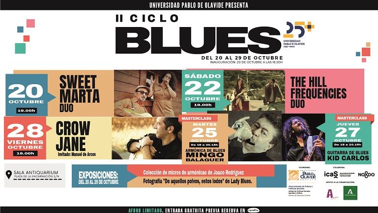 El blues es el protagonista del grueso de la programación de los próximos días en la Sala Antiquarium con la celebración, del 20 al 29 de octubre, de la segunda edición del Ciclo de Blues de la Universidad Pablo de Olavide, que contará con conciertos, exposiciones y clases magistrales de armónica y guitarra enfocadas en la difusión de este género musical. Y todo ello con carácter gratuito.