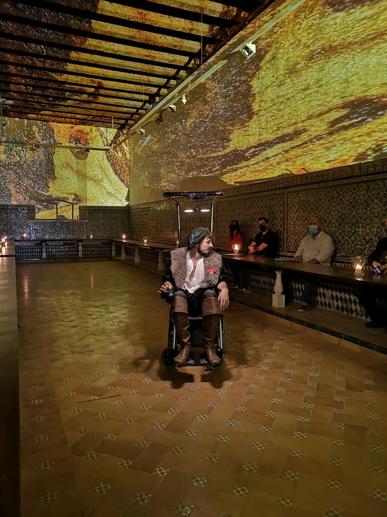 La puesta en escena se desarrolla en un espacio atemporal que, en este caso, utiliza el refectorio de Santa Clara, enclave ideal que conserva esa temporalidad neutra, así como el aire sobrenatural y espiritual que contribuirá a crear la atmósfera que envuelve esta propuesta. Para ello, en las paredes del refectorio, a través de abstracciones proyectadas se ilustrará el relato de la gran epopeya. También, de forma constante y durante todo el espectáculo, los sonidos del mar mezclados con ecos lejanos de la travesía estarán presentes; sonidos y silencios del océano perdido y remoto a la búsqueda de la tensión dramática necesaria para contar esta historia. Con este planteamiento audiovisual se quiere aportar un toque de contemporaneidad para llevar al público por mares y cielos, presagiando las tormentas y los claroscuros de esta impresionante aventura.
