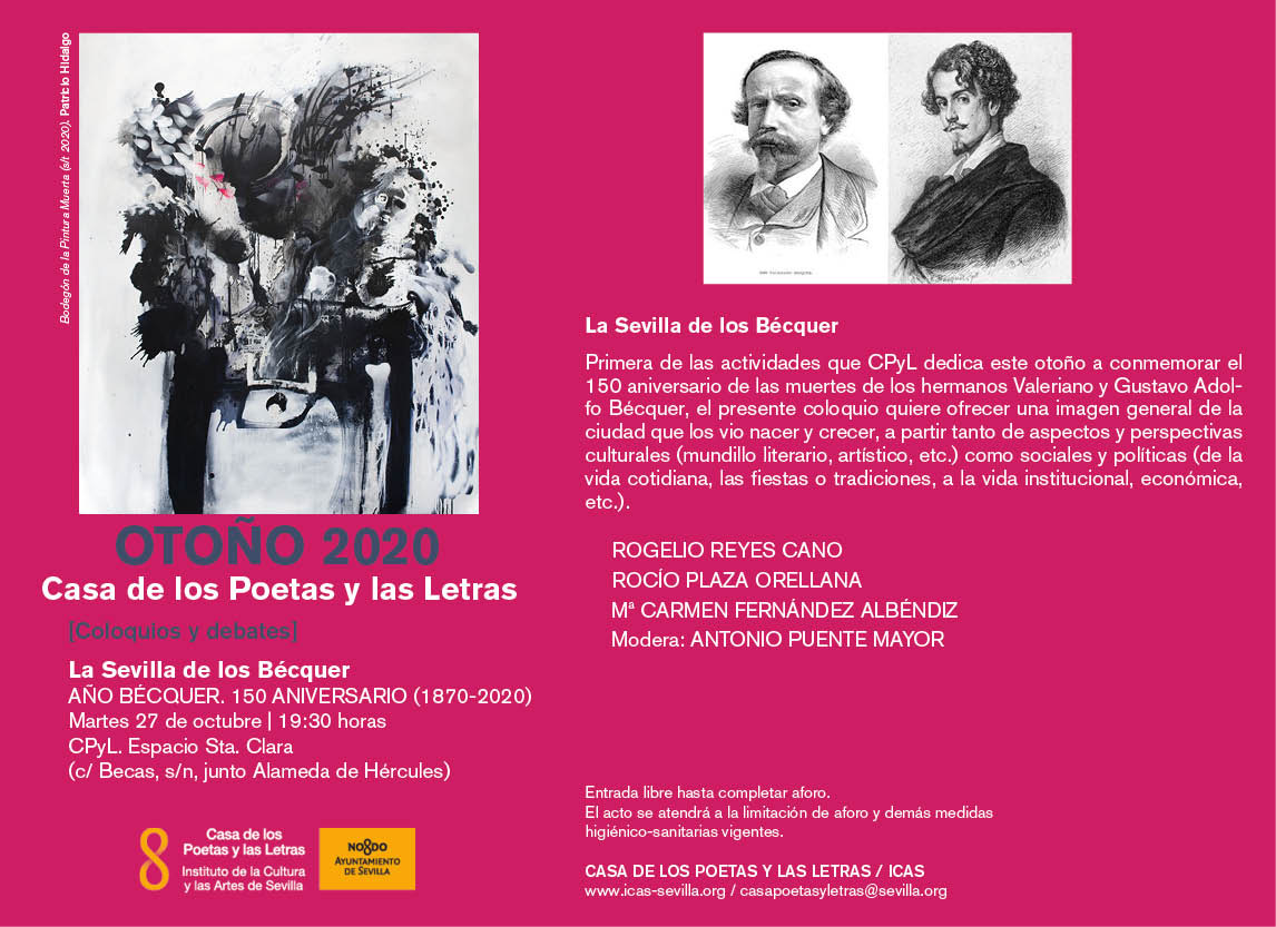 La Casa de los Poetas y las Letras del Instituto de la Cultura y las Artes (ICAS) del Ayuntamiento de Sevilla inaugurará el próximo martes 27 su particular homenaje a los hermanos Gustavo Adolfo y Valeriano Bécquer con la primera de las actividades que ha programado con motivo de la celebración del 150 aniversario de sus muertes. ‘La Sevilla de los Bécquer’ lleva por título este coloquio en el que varios expertos ofrecerán una imagen de la ciudad que los vio nacer y crecer, a partir tanto de aspectos y perspectivas culturales, como sociales y políticas.