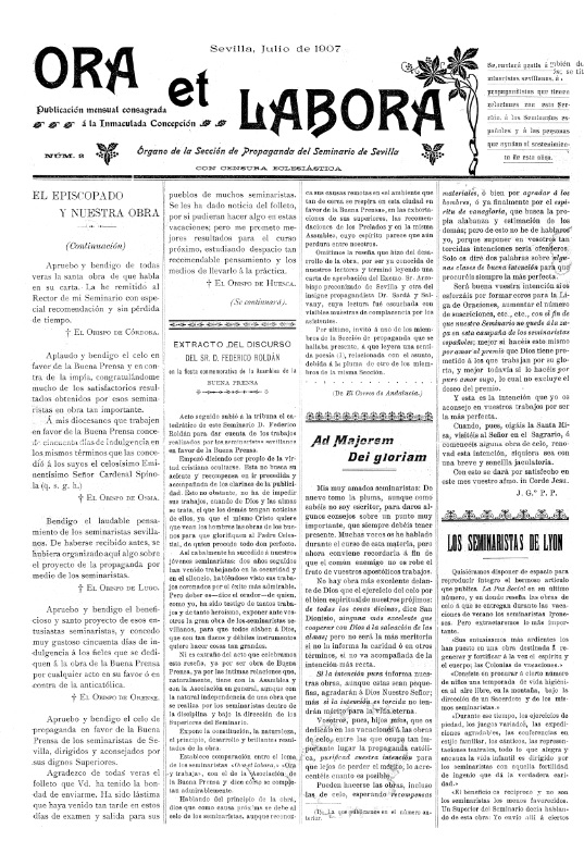 Gracias a la generosa donación de hace unos años del Archivo Municipal de Toledo, la Hemeroteca Municipal de Sevilla pudo incorporar a su colección una copia digital de la mensual Ora et Labora, dedicada a la Inmaculada Concepción (1907-1930). Recientemente, esta copia digital ha sido sometida a un proceso de reconocimiento de caracteres (OCR, por sus siglas en inglés), lo que ha permitido convertir el contenido en texto editable y facilitar su acceso y búsqueda. Nos complace informar que ahora la revista Ora et Labora se encuentra disponible para su consulta en NO8DO Digital, el repositorio en línea de la Hemeroteca Municipal de Sevilla.