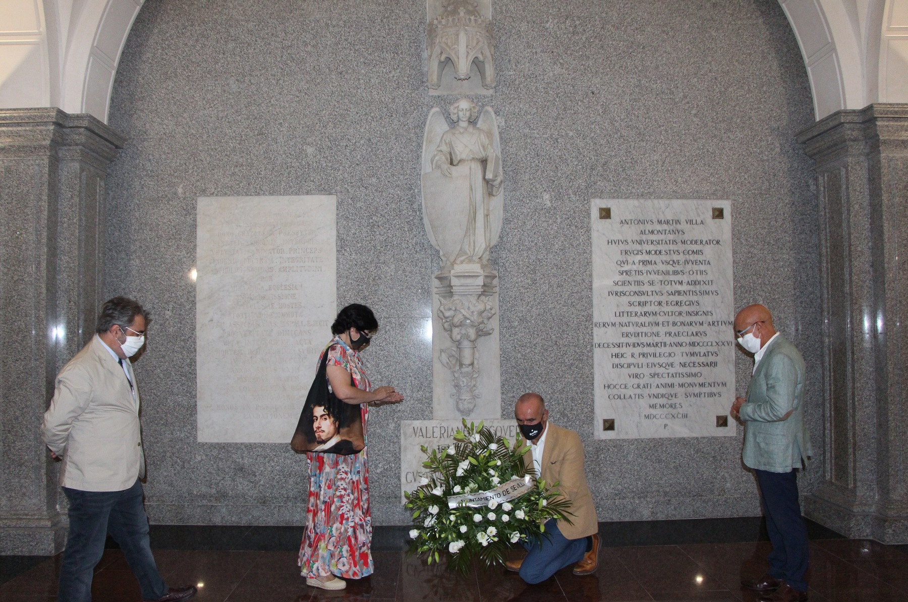 El Ayuntamiento de Sevilla ha rendido hoy homenaje hoy al pintor Valeriano Bécquer en la víspera del 150 aniversario del fallecimiento del artista, cuyos restos yacen junto a los de su hermano, el poeta Gustavo Adolfo Bécquer, en el Panteón de los Sevillanos Ilustres, en los bajos de la Facultad de Bellas Artes. En este lugar, y con un sencillo acto, el delegado de Hábitat Urbano, Cultura y Turismo, Antonio Muñoz, ha realizado una ofrenda floral junto con Pilar Alcalá, presidenta de la Asociación Cultural ‘Con los Bécquer en Sevilla’, Luis Francisco Martínez Montiel, Luis Francisco Martínez Montiel, director del Secretariado de Patrimonio Histórico-Artístico de la Universidad de Sevilla, y el decano de Bellas Artes, Daniel Bilbao.