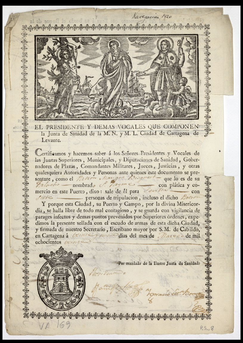 Este es el caso del documento que se publica, incluido entre los fondos del Archivo Municipal de Sevilla (Servicio de Archivo, Hemeroteca y Publicaciones del ICAS). En esta ocasión, se trata de un navío procedente de Cartagena –el San Jaime-, con siete marineros de tripulación, incluido su patrón, Mariano Bisquert. En 1820 se dirigía a Sevilla con 600 fanegas de cebada. El documento está encabezado por una invocación gráfica de carácter religioso, con los grabados de la Virgen, acompañada de dos santos muy vinculados a las enfermedades, San Sebastián y San Roque (MFG).