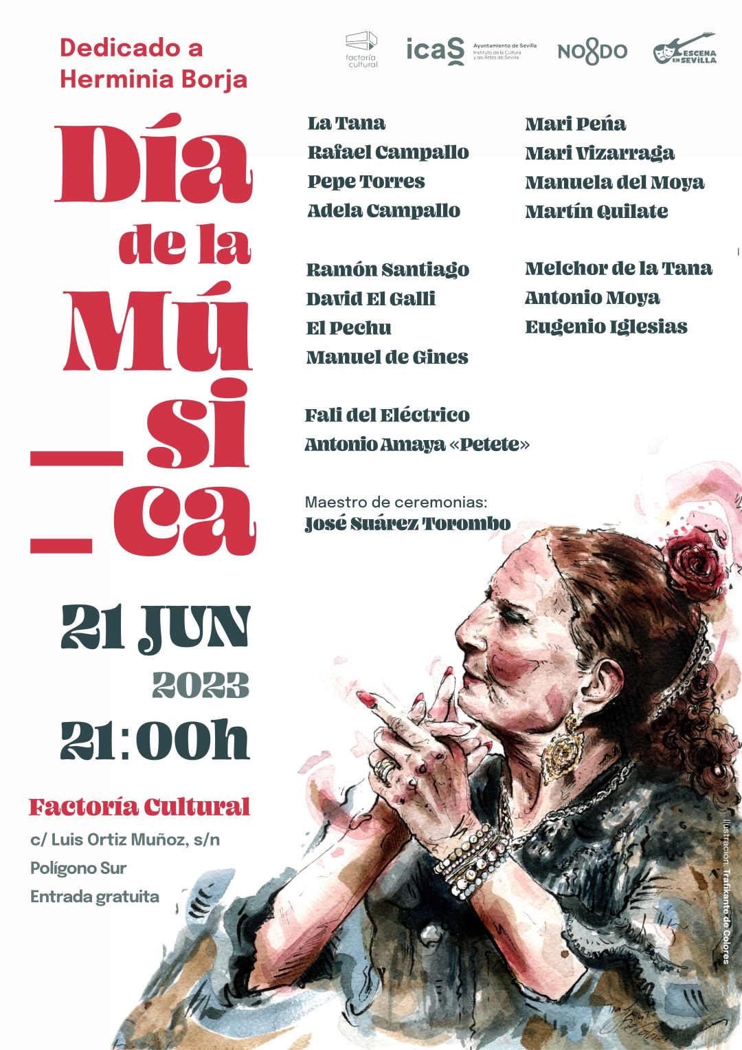 Figuras como La Tana, Rafael Campallo, Pepe Torres, Adela Campallo, Mari Peña, Mari Vizarraga, Manuela del Moya, Martín Quilate, Ramón Santiago, David el Galli, El Pechu, Manuel de Gines, Melchor de la Tana, Antonio Moya, Eugenio Iglesias, Fali del Eléctrico o Antonio Amaya ‘Petete’, entre otros, ensalzarán su figura en este espectáculo que estará conducido por José Suárez ‘Torombo’ en el escenario ubicado en la calle Luis Ortiz Muñoz, frente a Factoría Cultural.
